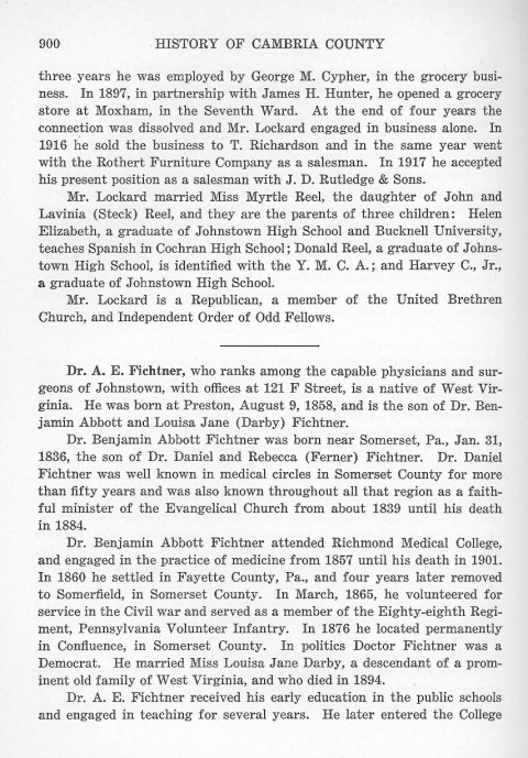 three years he was employed by George M. Cypher, in the grocery business. In 1897, in partnership with James H. Hunter, he opened a grocery store at Moxham, in the Seventh Ward. At the end of four years the connection was dissolved and Mr. Lockard engaged in business alone. In 1916 he sold the business to T. Richardson and in the same year went with the Rothert Furniture Company as a salesman. In 1917 he accepted his present position as a salesman with J. D. Rutledge & Sons. Dr. A. E. Fichtner, who ranks among the capable physicians and surgeons of Johnstown, with offices at 121 F Street, is a native of West Virginia. He was born at Preston, August 9, 1858, and is the son of Dr. Benjamin Abbott and Louisa Jane (Darby) Fichtner. Dr. Benjamin Abbott Fichtner was born near Somerset, Pa., Jan. 31, 1836, the son of Dr. Daniel and Rebecca (Ferner) Fichtner. Dr. Daniel Fichtner was well known in medical circles in Somerset County for more than fifty years and was also known throughout all that region as a faithful minister of the Evangelical Church from about 1839 until his death in 1884 Dr. Benjamin Abbott Fichtner attended Richmond Medical College, and engaged in the practice of medicine from 1857 until his death in 1901. In 1860 he settled in Fayette County, Pa., and four years later removed to Somerfield, in Somerset County. In March, 1865, he volunteered for service in the Civil war and served as a member of the Eighty-eighth Regiment, Pennsylvania Volunteer Infantry. In 1876 he located permanently in Confluence, in Somerset County. In politics Doctor Fichtner was a Democrat. He married Miss Louisa Jane Darby, a descendant of a prominent old family of West Virginia, and who died in 1894. Dr. A. E. Fichtner received his early education in the public schools and engaged in teaching for several years. He later entered the College |