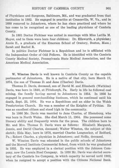 of Physicians and Surgeons, Baltimore, Md., and was graduated from that institution in 1882. He engaged in practice at Cranesville, W. Va., and in 1888 removed to Johnstown, where he has since practiced and where he has come to be recognized as one of the leading physicians of Cambria County. W. Winston Davis is well known in Cambria County as the capable postmaster of Johnstown. He is a native of that city, born March 17, 1874, the son of Thomas D. and Jane (Charles) Davis. Thomas D. Davis, deceased, son of David M. and Elizabeth (Watkins) Davis, was born in 1840, at Pittsburgh, Pa. Early in life he followed coal mining, the family having moved to Johnstown in 1854. In 1866 he engaged in general merchandising business, which he continued until hid death, Sept. 23, 1894. He was a Republican and an elder in the Welch Presbyterian Church. He was a member of the Knights of Pythias. He was an excellent citizen and stood high in the community. In 1866 Mr. Davis was married to Jane Charles, of Ebensburg, who was born in North Wales. She died March 11, 1904. She possessed some literary ability and frequently wrote for the press. The children born to Mr. and Mrs. Thomas D. Davis were as follows: Elizabeth Margaret, Jennie, and David Charles, deceased; Walter Winston, the subject of this sketch; Elda May, born in 1878, married Charles Longnecker, of Bedford, Pa.; Robert Charles, a physician in Johnstown; and Nellie, deceased. W. Winston Davis was educated in the public schools of Johnstown and the Morrell Institute Commercial School, from which he was graduated in 1893. He was employed in a clerical position with the Johnson Company, now the Lorain Steel Company. In 1898 Mr. Davis was elected secretary of the Cambria Ice Company, I which capacity he served until 1902, when he resigned to accept a position with the Citizens National Bank. |
