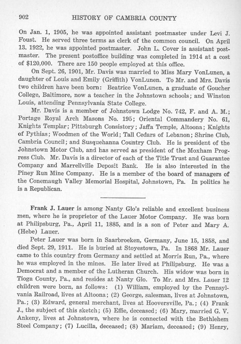On Jan. 1, 1905, he was appointed assistant postmaster under Levi J. Foust. He served three terms as clerk of the common council. On April 13, 1922, he was appointed postmaster. John L. Cover is assistant postmaster. The present postoffice building was completed in 1914 at a cost of $120,000. There are 150 people employed at this office. Frank J. Lauer is among Nanty Glo's reliable and excellent business men, where he is proprietor of the Lauer Motor Company. He was born at Phillipsburg, Pa., April 11, 1885, and is a son of Peter and Mary A. (Hebe) Lauer. Peter Lauer was born in Saarbroeken, Germany, June 15, 1858, and died Sept. 29, 1911. He is buried at Stoyestown, Pa. In 1868 Mr. Lauer came to this country from Germany and settled at Morris Run, Pa., where he was employed in the mines. He later lived at Phillipsburg. He was a Democrat and a member of the Lutheran Church. His widow was born in Tioga County, Pa., and resides at Nanty Glo. To Mr. and Mrs. Lauer 12 children were born, as follows: (1) William, employed by the Pennsylvania Railroad, live at Altoona; (2) George, salesman, lives at Johnstown, Pa.; (3) Edward, general merchant, lives at Hooversville, Pa.; (4) Frank J., the subject of this sketch; (5) Effie, deceased; (6) Mary, married G. V. Ankeny, lives at Johnstown, where he is connected with the Bethlehem Steel Company; (7) Lucilla, deceased; (8) Mariam, deceased; (9) Henry |