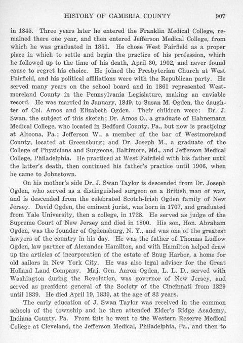 in 1845. Three years later he entered the Franklin Medical College, remained there one year, and then entered Jefferson Medical College, from which he was graduated in 1851. He chose West Fairfield as a proper place in which to settle and begin the practice of his profession, which he followed up to the time of his death, April 30, 1902, and never found cause to regret his choice. He joined the Presbyterian Church at West Fairfield, and his political affiliations were with the Republican party. He served many years on the school board and in 1861 represented Westmoreland County in the Pennsylvania Legislature, making an enviable record. He was married in January, 1849, to Susan M. Ogden, the daughter of Col. Amos and Elizabeth Ogden. Their children were: Dr. J. Swan, the subject of this sketch; Dr. Amos O., a graduated of Hahnemann Medical College, who located in Bedford County, Pa., but now is practicing at Altoona, Pa.; Jefferson W., a member of the bar of Westmoreland County, located at Greensburg; and Dr. Joseph M., a graduate of the College of Physicians and Surgeons, Baltimore, Md., and Jefferson Medical College, Philadelphia. He practiced at West Fairfield with his father until the latter's death, then continued his father's practice until 1906, when he came to Johnstown.