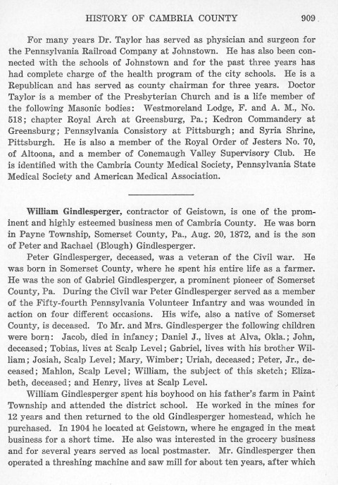 For many years Dr. Taylor has served as physician and surgeon for the Pennsylvania Railroad Company at Johnstown. He has also been connected with the schools of Johnstown and for the past three years has had complete charge of the health program of the city schools. He is a Republican and has served as county chairman for three years. Doctor Taylor is a member of the Presbyterian Church and is a life member of the following Masonic bodies: Westmoreland Lodge, F. and A. M., No. 518; chapter Royal Arch at Greensburg, Pa.,; Kedron Commandery at Greensburg; Pennsylvania Consistory at Pittsburgh; and Syria Shrine, Pittsburgh. He is also a member of the Royal Order of Jesters No. 70, of Altoona, and a member of Conemaugh Valley Supervisory Club. He is identified with the Cambria County Medical Society, Pennsylvania State Medical Society and American Medical Association. William Gindlesperger, contractor of Geistown, is one of the prominent and highly esteemed business men of Cambria County. He was born in Payne Township, Somerset County, Pa., Aug. 20, 1872, and is the son of Peter and Rachael (Blough) Gindlesperger. Peter Gindlesperger, deceased, was a veteran of the Civil war. He was born in Somerset County, where he spent his entire life as a farmer. He was the son of Gabriel Gindlesperger, a prominent pioneer of Somerset County, Pa. During the Civil war Peter Gindlesperger served as a member of the Fifty-fourth Pennsylvania Volunteer Infantry and was wounded in action on four different occasions. His wife, also a native of Somerset County, is deceased. To Mr. and Mrs. Gindlesperger the following children were born: Jacob, died in infancy; Daniel J., lives at Alva, Okla; John, deceased; Tobias, lives at Scalp Level; Gabriel, lives with his brother William; Josiah, Scalp Level; Mary, Wimber; Uriah, deceased; Peter, Jr., deceased; Mahlon, Scalp Level; William, the subject of this sketch; Elizabeth, deceased; and Henry, lives at Scalp Level. William Gindlesperger spent his boyhood on his father's farm in Paint Township and attended the district school. He worked in the mines for 12 years and then returned to the old Gindlesperger homestead, which he purchased. In 1904 he located at Geistown, where he engaged in the meat business for a short time. He also was interested in the grocery business and for several years served as local postmaster. Mr. Gindlesperger then operated a threshing machine and saw mill for about ten years, after which |