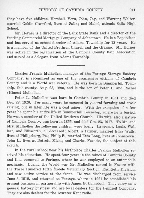 they have five children, Hershell, Vern, John Jay, and Warren; Walter, married Goldie Crawford, lives at Salix; and Mabel, attends Salix High School. Charles Francis Mulhollen, manager of the Portage Storage Battery Company, is recognized as one of the progressive citizens of Cambria County and is a World war veteran. He was born in Summerhill Township, this county, Aug. 23, 1890, and is the son of Peter L. and Rachel (Himes) Mulhollen. Peter L. Mulhollen was born in Cambria County in 1851 and died Dec. 28, 1920. For many years he engaged in general farming and stock raising, but in later life was a coal miner. With the exception of a few years he spent his entire life in Summerhill Township, where he is buried. He was a member of the United Brethren Church. His wife, also a native of Cambria County, was born in 1855, and died Oct. 23, 1917. To Mr. and Mrs. Mulhollen the following children were born: Lawrence, Louis, Wallace, and Ellsworth, all deceased: Albert, a farmer, married Eliza Walls, lives at Philipsburg, Pa.; Philip E., married Etta Long, lives at Johnstown; John L., lives at Detroit, Mich; and Charles Francis, the subject of this sketch. In the rural school near his birthplace Charles Francis Mulhollen received his education. He spent four years in the mines of Cambria County and then removed to Portage, where he was employed as an automobile mechanic. During the World war Mr. Mulhollen served in France with the Three Hundred Fifth Mobile Veterinary Section, Eightieth Division, and saw active service at the front. He was discharged from service June 3, 1919, and returned to Portage, where in 1921 he established his present business in partnership with James G. Campbell. They carry on a general battery business and are local dealers for the Pennzoil Company. They are also dealers for the Atwater Kent radio. |