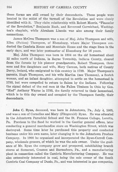 these farms are still owned by their descendants. These people were located in the midst of the turmoil of the Revolution and were closely identified with it. They claim relationship with Robert Morris, "Financier of the Revolution," Benjamin Rush, and Reverend Carmichael, Washington's chaplain, while Abraham Lincoln was also among their family connections. John C. Ryan, deceased, was born in Johnstown, Pa., July 4, 1865, and was a son of Cornelius and Mary (Fitzgerald) Ryan. He was educated in the Johnstown Parochial School and the St. Frances College, Loretta, Pa. Previous to the flood he worked in the Gautier general offices, later conducting a general merchandise store on Washington Street, which was destroyed. Some time later he purchased this property and conducted business under his own name, later changing it to the Johnstown Produce Company. In 1900 he organized and incorporated the Ryan-Correll Company, wholesale grocers, of which he was the sole owner. Under the guidance of Mr. Ryan the company grew and prospered, establishing branch stores at Somerset, Cresson and Barnesboro, Pa., and a manufacturing plant in connection called the Cambria Manufacturing Company. He was also extensively interested in coal, being the sole owner of the South Cambria Coal Company of Dunlo, Pa., and was interested in gas companies, |