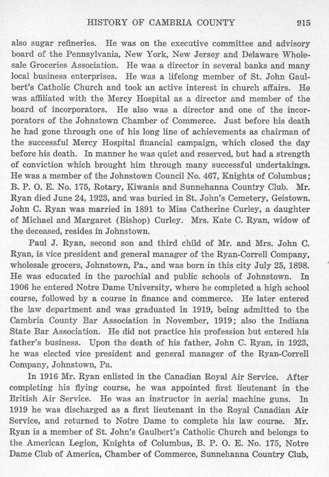 also sugar refineries. He was on the executive committee and advisory board of the Pennsylvania, New York, New Jersey and Delaware Wholesale Groceries Association. He was a director in several banks and many local business enterprises. He was a lifelong member of St. John Gaulbert's Catholic Church and took an active interest in church affairs. He was affiliated with the Mercy Hospital as a director and member of the board of incorporators. He also was a director and one of the incorporators of the Johnstown Chamber of Commerce. Just before his death he had gone through on of his long line of achievements as chairman of the successful Mercy Hospital financial campaign, which closed the day before his death. In manner he was quiet and reserved, but had a strength of conviction which brought him through many successful undertakings. He was a member of the Johnstown Council No. 467,, Knights of Columbus; B. P. O. E. No. 175, Rotary, Kiwanis and Sunnehanna Country Club. Mr. Ryan died June 24, 1923, and was buried in St. John's Cemetery, Geistown. John C. Ryan was married in 1891 to Miss Catherine Curley, a daughter of Michael and Margaret (Bishop) Curley. Mrs. Kate C. Ryan, widow of the deceased, resides in Johnstown.