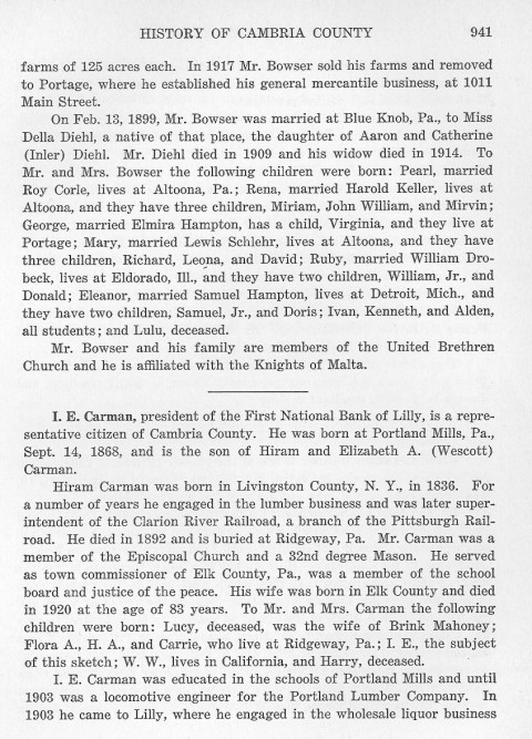 farms of 125 acres each. In 1917 Mr. Bowser sold his farms and removed to Portage, where he established his general mercantile business, at 1011 Main Street. I. E. Carman, president of the First National Bank of Lilly, is a representative citizen of Cambria County. He was born at Portland Mills, Pa., Sept. 14, 1868, and is the son of Hiram and Elizabeth A. (Wescott) Carman. Hiram Carman was born in Livingston County, N. Y., in 1836. For a number of years he engaged in the lumber business and was later superintendent of the clarion River Railroad, a branch of the Pittsburgh Railroad. He died in 1892 and is buried at Ridgeway, Pa. Mr. Carman was a member of the Episcopal Church and a 32nd degree Mason. He served as town commissioner of Elk County, Pa., was a member of the school board and justice of the peace. His wife was born in Elk County and died in 1920 at the age of 83 years. To Mr. and Mrs. Carman the following children were born: Lucy, deceased, was the wife of Brink Mahoney; Flora A., H. A., and Carrie, who live at Ridgeway, Pa.; I. E., the subject of this sketch; W. W. lives in California, and Harry, deceased. I. E. Carman was educated in the schools of Portland Mills and until 1903 was a locomotive engineer for the Portland Lumber Company. In 1903 he came to Lilly, where he engaged in the wholesale liquor business |