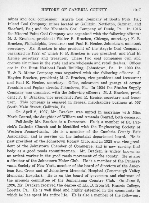 mines and coal companies: Argyle Coal Company of south Fork, Pa.; Inland Coal Company, mines located at Gallitzin, Nettleton, Saxman, and Starford, Pa.; and the Mountain Coal Company of Dunlo, Pa. In 1916 the Mineral Point Coal Company was organized with the following officers: M. J. Bracken, president; Walter Bracken, Chicago, secretary; F. B. Bracken, Philadelphia, treasurer; and Paul E. Henise, Johnstown, assistant secretary. Mr. Bracken is also president of the Argyle Coal Company, organized in 1922, of which F. B. Bracken is vice resident, and Paul E. Henise secretary and treasurer. These two coal companies own and operate six mines in the state and are wholesale and retail dealers. Offices are in the First National Bank Building, Johnstown, Pa. In 1920 the B. & B. Motor Company was organized with the following officers: J. Hayden Bracken, president; M. j. Bracken, vice president and treasurer; and Paul E. Henise, secretary. Office, salesroom and garage at corner
