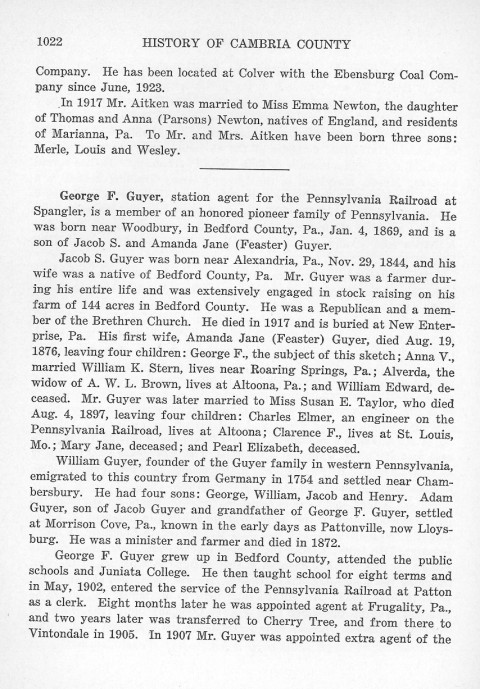 Company. He has been located at Colver with the Ebensburg Coal Company since June, 1923. George F. Guyer, station agent for the Pennsylvania Railroad at Spangle, is a member of an honored pioneer family of Pennsylvania. He was born near Woodbury, in Bedford County, Pa., Jan. 4, 1869, and is a son of Jacob S. and Amanda Jane (Feaster) Guyer. Jacob S. Guyer was born near Alexandria, Pa., Nov. 29, 1844, and his wife was a native of Bedford County, Pa. Mr. Guyer was a farmer during his entire life and was extensively engaged in stock raising on his farm of 144 acres in Bedford County. He was a Republican and a member of the Brethren Church. He died in 1917 and is buried at New Enterprise, Pa. His first wife, Amanda Jane (Feaster) Guyer, died Aug. 19, 1876, leaving four children: George F., the subject of this sketch; Anna V., married William K. Stern, lives near Roaring Springs, Pa.; Alverda, the widow of A. W. L. Brown, lives at Altoona, Pa.; and William Edward, deceased. My Guyer was later married to Miss Susan E. Taylor, who died Aug. 4, 1897, leaving four children: Charles Elmer, an engineer on the Pennsylvania Railroad, lives at Altoona; Clarence F., lives at Louis, Mo.; Mary Jane, deceased; and Pearl Elizabeth, deceased. William Guyer, founder of the Guyer family in western Pennsylvania, emigrated to this country from Germany in 1754 and settled near Chambersbury. He had four sons; George, William, Jacob and Henry. Am\dam Guyer, son of Jacob Guyer and grandfather of George F. Guyer, settled at Morrison Cove, Pa., known in the early days at Pattonville, now Lloysburg. He was a minister and farmer and died in 1872. George F. Guyer grew up in Bedford County attended the public schools and Juniata College. He then taught school for eight terms and in May, 1902, entered the service of the Pennsylvania Railroad at Patton as a clerk. Eight months later he was appointed agent at Frugality, Pa., and two years later was transferred to Cherry Tree, and from there to Vintondale in 1905. In 1907 Mr. Guyer was appointed extra agent of the |