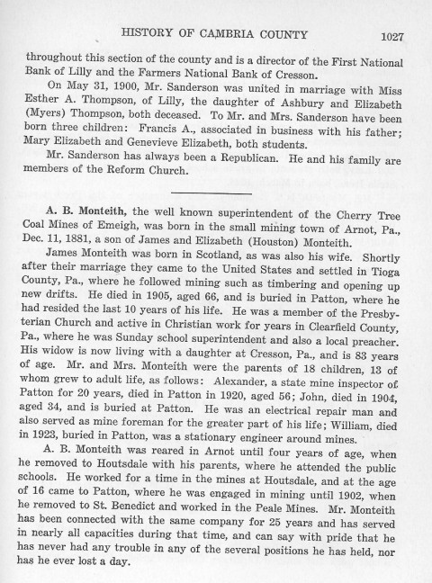 throughout this section of the country and is a director of the First National Bank of Lilly and the Farmers National Bank of Cresson. A. B. Monteith, the well known superintendent of the Cherry Tree Coal Mines of Emeigh, was born in the small mining town of Arnot, Pa., Dec. 11, 1881, a son of James and Elizabeth (Houston) Monteith. James Monteith was born in Scotland, as was also his wife. Shortly after their marriage they came to the United States and settled in Tioga County, Pa., where he followed mining such as timbering and opening up new drifts. He died in 1905, aged 66, and is buried in Patton, where he had resided the last 10 years of his life. He was a member of the Presbyterian Church and active in Christian work for years in Clearfield County, Pa., where he was Sunday school superintendent and also a local preacher. His widow is now living with a daughter at Cresson, Pa., and is 88 years of age. Mr. and Mrs. Monteith were the parents of 18 children, 18 of whom grew to adult life, as follows: Alexander, a state mine inspector of Patton for 20 years, died in Patton in 1920, aged 56; John, died in 1904, aged 34, and is buried at Patton. He was an electrical repair man and also served as mine foreman for the greater part of his life; William, died in 1923, buried in Patton, was a stationary engineer around mines. A. B. Monteith was reared in Arnot until four years of age, when he removed to Houtsdale with his parents, where he attended the public schools. He worked for a time in the mines at Houtsdale, and at the age of 16 he came to Patton, where he was engaged in mining until 1902, when he removed to St. Benedict and worked in the Peale Mines. Mr. Monteith has been connected with the same company for 25 years and has served in nearly all capacities during that time, and can say with pride that he has never had any trouble in any of the several positions he has held, nor has he ever lost a day. |