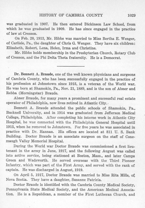 was graduated in 1907. He then entered Dickinson Law School, from which he was graduated in 1909. He has since engaged in the practice of law at Cresson. Dr. Bennett A. Braude, one of the well known physicians and surgeons of Cambria County, who has been successfully engaged in the practice of his profession at Johnstown since 1915, is a veteran of the World war. He was born at Shamokin, Pa., Nov. 21, 1889, and is the son of Abner and Rebba (Morningstar) Braude. Abner Braude, for many years a prominent and successful real estate operator of Philadelphia, now lives retired in Atlantic City. Bennett A. Braude attended the public schools of Shamokin, Pa., Bucknell University, and in 1914 was graduated from Jefferson Medical College, Philadelphia. After completing his interne work in Atlantic City Hospital, he was connected with the Philadelphia General Hospital until 1915, when he removed to Johnstown. For five years he was associated in practice with Dr. Hannan. His offices are located at 811 U.S. Bank Building. Dr. Braude is an associate surgeon on the staff of Conemaugh Valley Memorial Hospital. During the World war Doctor Braude was commissioned a first lieuTenant in the army in June, 1917, and the following August was called into active service, being stationed at Boston, Mass., and later Camps Green and Wadsworth. He served overseas with the Third Pioneer Infantry, which was part of the First Army, and served with the rank of captain. He was discharged in August, 1919. On April 5, 1917, Doctor Braude was married to Miss Rita Mills, of Nova Scotia. They have a daughter, Suzanne Patricia. Doctor Braude is identified with the Cambria County Medical Society, Pennsylvania State Medical Society, and the American Medical Association. He is a Republican, a member of the First Lutheran Church, and |