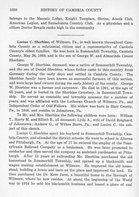 belongs to the Masonic Lodge, Knight Templars, Shrine, Acasia Club, American Legion, and Sunnehanna Country Club. As a physician and a citizen Doctor Braude ranks high in the community. Lucian C. Sherbine, of Wilmore, Pa., is well known throughout Cambria County as a substantial citizen and a representative of Cambria County's oldest families. He was born in Summerhill Township, Cambria County, May 26, 1869, and is the son of George W. and Almarinda Conser Sherbine. George W. Sherbine, deceased, was a native of Summerhill township, and the son of Daniel Sherbine, whose father came to this country from Germany during the early days and settled in Cambria County. The Sherbine family have been known as successful farmers of this section, and were large land owners during the early history of the county. George W. Sherbine was a farmer and carpenter. He died in 1901, at the age of 65 years, and is buried in the Sherbine Cemetery, in Summerhill Township. He served as constable and township assessor for a number of years, and was affiliated with the Lutheran Church of Wilmore, Pa., and Independent Order of Odd Fellows. His widow was born in Blair County, Pa., in 1846, and resides in Johnstown, Pa. To Mr. and Mrs. Sherbine the following children were born: William T., Harry M. and Elliott B., all deceased; Lyda A., wife of David Reighard, of Johnstown; Andrew G., of Wilkes Barre, Pa.; and Lucien C., the subject of this sketch. Lucian C. Sherbine spent his boyhood in Summerhill Township, Cambria County, and attended the district schools. He went to school in Altoona and Pittsburgh, Pa. At the age of 17 he entered the employ of the Pennsylvania Railroad Company as a brakeman. He was later promoted to conductor and then served the company as assistant yardmaster at Pitts-burgh. After 12 years at railroading Mr. Sherbine purchased the old homestead in Summerhill Township, and opened up a blacksmith and wagon making establishment at Wilmore. He improved the old homestead, building a house and barn on the place and improved the land. He then purchased the Dr. Kern farm, a beautiful home in the Borough of Wilmore, where he now resides. At about the beginning of the World war in 1914 he sold his blacksmith business and leased a piece of coal |