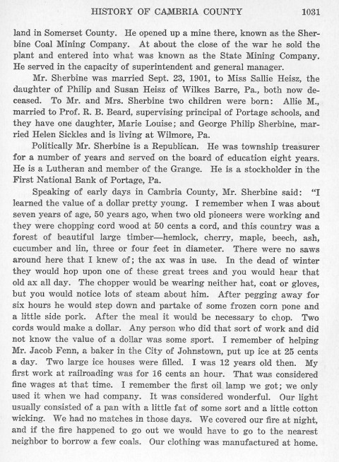 Speaking of early days in Cambria County, Mr. Sherbine said: "I learned the value of a dollar pretty young. I remember when I was about seven years of age, 50 years ago, when two old pioneers were working and they were chopping cord wood at 50 cents a cord, and this country was a forest of beautiful large timber-hemlock, cherry, maple, beech, ash, cucumber and lin, three or four feet in diameter. There were no saws around here that I knew of; the ax was in use. In the dead of winter they would hop upon one of these great trees and you would hear that old ax all day. The chopper would be wearing neither hat, coat or gloves, but you would notice lots of steam about him. After pegging away for six hours he would step down and partake of some frozen corn pone and a little side pork. After the meal it would be necessary to chop. Two cords would make a dollar. Any person who did that sort of work and did not know the value of a dollar was some sport. I remember of helping Mr. Jacob Fenn, a baker in the City of Johnstown, put up ice at 25 cents a day. Two large ice houses were filled. I was 12 years old then. My first work at railroading was for 16 cents an hour. That was considered fine wages at that time. I remember the first oil lamp we got; we only used it when we had company. It was considered wonderful. Our light usually consisted of a pan with a little fat of some sort and a little cotton wicking. We had no matches in those days. We covered our fire at night, and if the fire happened to go out we would have to go to the nearest neighbor to borrow a few coals. Our clothing was manufactured at home.