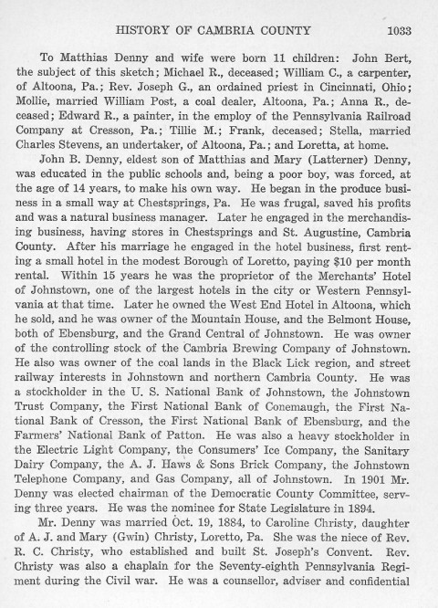 John B. Denny, eldest son of Matthias and Mary (Latterner) Denny, was educated in the public schools and, being a poor boy was forced, at the age of 14 years, to make his own way. He began in the produce business in a small way at Chestsprings, Pa. He was frugal, saved his profits and was a natural business manager. Later he engaged in the merchandising business, having stores in Chestsprings and St. Augustine, Cambria County. After his marriage he engaged in the hotel business, first renting a small hotel in the modest Borough of Loretto, paying $10 per month rental. Within 15 years he was the proprietor of the Merchants' Hotel of Johnstown, one of the largest hotels in the city or Western Pennsylvania at that time. Later he owned the West End Hotel in Altoona, which he sold, and he was owner of the Mountain House, and the Belmont House, both of Ebensburg, and the Grand Central of Johnstown. He was owner of the controlling stock of the Cambria Brewing company of Johnstown. He also was owner of the coal lands in the Black Lick region, and street railway interests in Johnstown and northern Cambria County. He was a stockholder in the U. S. National Bank of Johnstown, the Johnstown Trust Company, the First National Bank of Conemaugh, the First National Bank of Cresson, the First National Bank of Ebensburg, and the Farmers' National Bank of Patton. He was also a heavy stockholder in the Electric Light company, the Consumers' Ice Company, the Sanitary Dairy Company, the A. J. Haws & Sons Brick Company, the Johnstown Telephone Company, and Gas Company, all of Johnstown. In 1901 Mr. Denny was elected chairman of the Democratic County Committee, serving three years. He was the m\nominee for State Legislature in 1894.