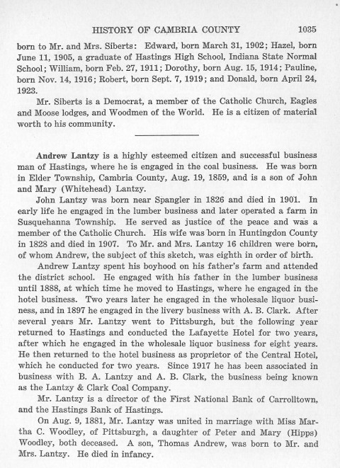 born to Mr. and Mrs. Siberts: Edward, born March 31, 1902; Hazel, born June 11, 1905, a graduate of Hastings High School, Indiana State Normal School; William, born Feb. 27, 1911; Dorothy, born Aug. 15, 1914; Pauline, born Nov. 14, 1916; Robert, born Sept. 7, 1919; and Donald, born April 24, 1923. Andrew Lantzy is a highly esteemed citizen and successful business man of Hastings, where he is engaged in the coal business. He was born in Elder Township, Cambria County, Aug. 19, 1859, and is a son of John and Mary (Whitehead) Lantzy. John Lantzy was born near Spangler in 1826 and died in 1901. In early life he engaged in the lumber business and later operated a farm in Susquehanna Township. He served as justice of the peace and was a member of the Catholic Church. His wife was born in Huntingdon County in 1828 and died in 1907. To Mr. and Mrs. Lantzy 16 children were born, of whom Andrew, the subject of this sketch, was eighth in order of birth. Andrew Lantzy spent his boyhood on his father's farm and attended the district school. He engaged with his father in the lumber business until 1888, at which time he moved to Hastings, where he engaged in the hotel business. Two years later he engaged in the wholesale liquor business and in 1897 he engaged in the livery business with A. B. Clark. After several years Mr. Lantzy went to Pittsburgh, but the following year returned to Hastings and conducted the Lafayette Hotel for two years, after which he engaged in the wholesale liquor business for eight years. He then returned to the hotel business as proprietor of the Central Hotel, which he conducted for two years. Since 1917 he has been associated in business with B. A. Lantzy and A. B. Clark, the business being known as the Lantzy & Clark Coal Company. Mr. Lantzy is a director of the First National Bank of Carrolltown, and the Hastings Bank of Hastings. On Aug. 9, 1881, Mr. Lantzy was united in marriage with Miss Martha C. Woodley, of Pittsburgh, a daughter of Peter and Mary (Hipps) Woodley, both deceased. A son, Thomas Andrew, was born to Mr. and Mrs. Lantzy. He died in infancy. |