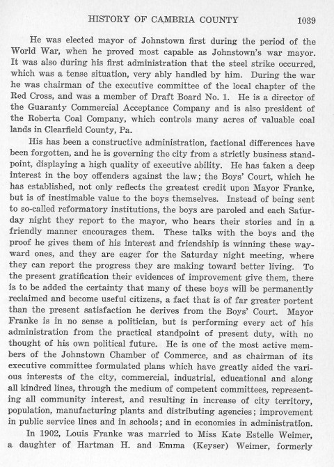 His has been a constructive administration, factional differences have been forgotten, and he is governing the city from a strictly business standpoint, displaying a high quality of executive ability. He has taken a deep interest in the boy offenders against the law; the Boys' Court, which he has established, not only reflects the greatest credit upon Mayor Franke, but is of inestimable value to the boys themselves. Instead of being sent to so-called reformatory institutions, the boys are paroled and each Saturday night they report to the mayor, who hears their stories and in a friendly manor encourages them. These talks with the boys and the proof he gives them of his interest and friendship is winning these wayward ones, and they are eager for the Saturday night meeting, where they can report the progress they are making toward better living. To the present gratification their evidence of improvement give them, there is to be added the certainty that many of these boys will be permanently reclaimed and become useful citizens, a fact that is of far greater portent than the present satisfaction he derives from the Boys' Court. Mayor Franke is in no sense a politician, but is performing every act of his administration for the practical standpoint of present duty, with no thought of his own political future. He is one of the most active members of the Johnstown Chamber of Commerce, and as chairman of its executive committee formulated plans which have greatly aided the various interests of the city, commercial, industrial, educational and along all kindred lines, through the medium of competent committees, representing all community interest, and resulting in increase of city territory, population, manufacturing plants and distributing agencies; improvement in public service lines and in schools; and in economics in administration.