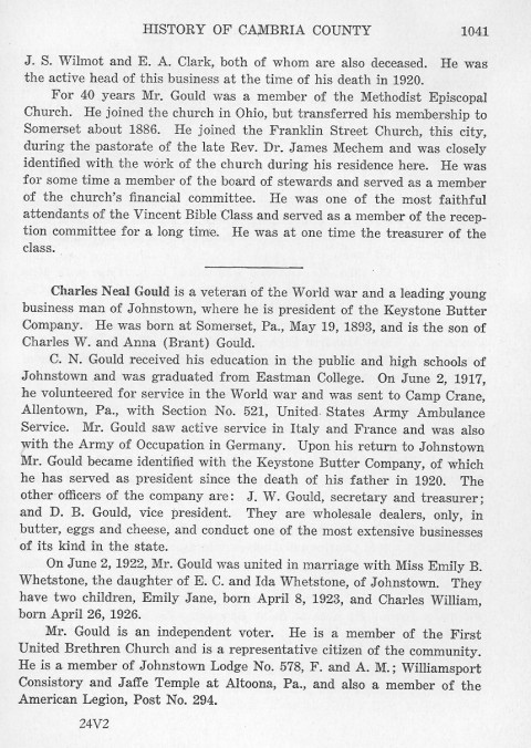 J.S. Wilmot and E.A. Clark, both of whom are also deceased. He was the active head of this business at the time of his death in 1920. Charles Neal Gould is a veteran of the World war and a leading young business man of Johnstown, where he is president of the Keystone Butter Company. He was born at Somerset, Pa., May 19, 1893, and is the son of Charles W. and Anna (Brant) Gould. C. N. Gould received his education in the public and high schools of Johnstown and was graduated from Eastman College. On June 2, 1917, he volunteered for service in the World war and was sent to Camp Crane, Allentown, Pa., with Section No. 521, United States Army Ambulance Service. Mr. Gould saw active service in Italy and France and was also with the Army of Occupation in Germany. Upon his return to Johnstown Mr. Gould became identified with the Keystone Butter Company, of which he has served as president since the death of his father in 1920. The other officers of the company are: J. W. Gould, secretary and treasurer; and D. B. Gould, vice president. They are wholesale dealers, only, in butter, eggs and cheese, and conduct one of the most extensive businesses of its kind in the state. On June 2, 1922, Mr. Gould was united in marriage with Miss Emily B. Whetstone, the daughter of E. C. and Ida Whetstone, of Johnstown. They have two children, Emily Jane, born April 8, 1923, and Charles William, born April 26, 1926. Mr. Gould is an independent voter. He is a member of the First United Brethren Church and is a representative citizen of the community. He is a member of Johnstown Lodge No. 578, F. and A. M.; Williamsport Consistory and Jaffe Temple at Altoona, Pa., and also a member of the American Legion Post No. 294. |