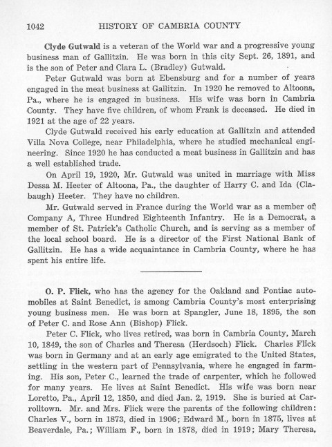 Clyde Gutwald is a veteran of the World war and a progressive young business man of Gallitzin. He was born in this city Sept. 26, 1891, and is the son of Peter and Clara L. (Bradley) Gutwald. O. P. Flick, who has the agency for the Oakland and Pontiac automobiles at Saint Benedict, is among Cambria County's most enterprising young business men. He was born in Spangler, June 18, 1895, the son of Peter C. and Rose Ann (Bishop) Flick. Peter C. Flick, who lives retired, was born in Cambria County, March 10, 1849, the son of Charles and Theresa (Herdsoch) Flick. Charles Flick was born in Germany and at an early age emigrated to the United States, settling in the western part of Pennsylvania, where he engaged in farming. His son, Peter C., learned the trade of carpenter, which he followed for many years. He lives at Saint Benedict. His wife was born near Loretto, Pa., April 12, 1850, and died Jan. 2, 1919. She is buried at Carrolltown. Mr. and Mrs. Flick were the parents of the following children: Charles V., born in 1873, died in 1906; Edward M., born in 1875, lives at Beaverdale, Pa.; William F., born in 1878, died in 1919; Mary Theresa, |