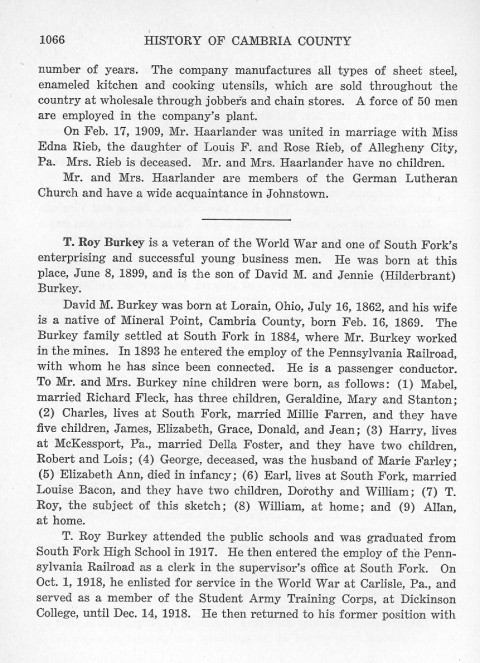 number of years. The company manufactures all types of sheet steel, enameled kitchen and cooking utensils, which are sold throughout the country at wholesale through jobbers and chain stores. A force of 50 men are employed in the company's plant. T. Roy Burkey is a veteran of the World War and one of South Fork's enterprising and successful young business men. He was born at this place, June 8, 1899, and is the son of David M. and Jennie (Hilderbrant) Burkey. David M. Burkey was born at Lorain, Ohio, July 16, 1863, and his wife is a native of Mineral Point, Cambria County, born Feb.15, 1869. The Burkey family settled at South Fork in 1884, where Mr. Burkey worked in the mines. In 1893 he entered the employ of the Pennsylvania Railroad, with whom he has since been connected. He is a passenger conductor. To Mr. and Mrs. Burkey nine children were born, as follows: (1) Mabel, married Richard Fleck, has three children, Geraldine, Mary and Stanton; (2) Charles, lives at South Fork, married Millie Farren, and they have five children, James, Elizabeth, Grace, Donald, and Jean; (3) Harry, lives at McKessport, Pa., married Della Foster, and they have two children, Robert and Lois; (4) George, deceased, was the husband of Marie Farley; (5) Elizabeth Ann, died in infancy; (6) Earl, lives at South Fork, married Louise Bacon, and they have two children, Dorothy and William; (7) T. Roy, the subject of this sketch; (8) William, at home; and (9) Allan, at home. T. Roy Burkey attended the public schools and was graduated from South Fork High School in 1917. He then entered the employ of the Pennsylvania Railroad as a clerk in the supervisor's office at South Fork. On Oct. 1, 1918, he enlisted for service in World War at Carlisle, Pa., and served as a member of the Student Army Training Corps, at Dickinson College, until Dec. 14, 1918. He then returned to his former position with |