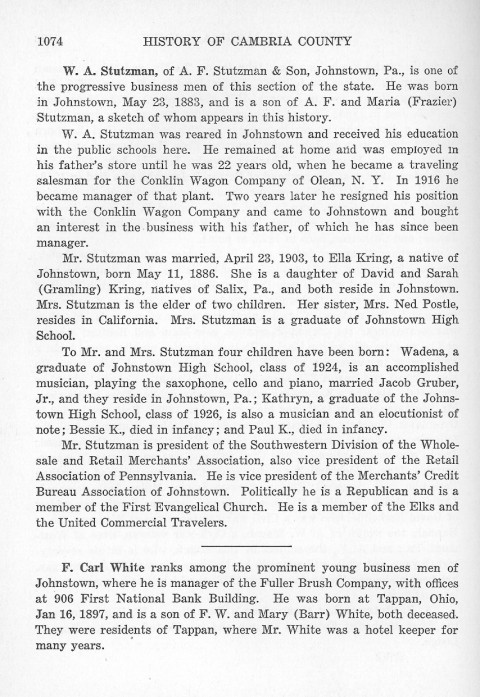 To Mr. and Mrs. Stutzman four children have been born: Wadena, a graduate of Johnstown High School, class of1924, is an accomplished musician, playing the saxophone, cello and piano, married Jacob Gruber, Jr., and they reside in Johnstown, Pa.; Kathryn, a graduate of the Johnstown High School, class of 1926, is also a musician and an elocutionist of note; Bessie K., died in infancy; and Paul K., died in infancy.