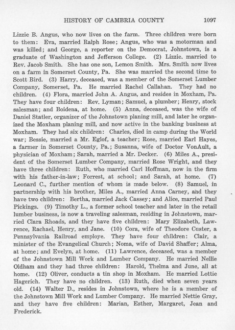Lizzie B. Angus, who now lives on the farm. Three children were born to them: Eva, married Ralph Rose; Angus, who was a motorman and was killed; and George, a reporter on the Democrat, Johnstown, is a graduate of Washington and Jefferson College. (2) Lizzie, married to Rev. Jacob Smith. She has one son, Lemon Smith. Mrs. Smith now lives on a farm in Somerset County, Pa., She was married the second time to Scott Bird. (3) Harry, deceased, was a member of the Somerset Lumber Company, Somerset, Pa. He married Rachel Callahan. They had no children. (4) Flora, married John A. Angus, and resides in Moxham, Pa. They have four children: Rev. Lyman; Samuel, a plumber; Henry, stock salesman; and Boidena, at home. (5) Anna, deceased, was the wife of Daniel Statler, organizer of the Johnstown planing mill, and later he organized the Moxham planing mill, and now active in the banking business at Moxham. They had six children: Charles, died in camp during the World war; Bessie, married a Mr. Eglof, a teacher; Rose, married Earl Hayes, a farmer in Somerset County, Pa; Susanna, wife of Doctor VonAult, a physician of Moxham; Sarah, married a Mr. Decker. (6) Miles A., president of the Somerset Lumber Company, married Rose Wright, and they have three children: Ruth, who married Carl Hoffman, now in the firm with his father-in-law; Forrest, at school; and Sarah, at home. (7) Leonard C., further mention of whom is made below. (8) Samuel, in partnership with his brother, Miles A., married Anna Carney, and they have two children: Bertha, married Jack Cassey; and Alice, married Paul Pickings. (9) Timothy L., a former school teacher and later in the retail lumber business, is now a traveling salesman, residing in Johnstown, married Clara Rhoads, and they have five children: Mary Elizabeth, Lawrence, Rachael, Henry, and Jane. (10) Cora, wife of Theodore Custer; a Pennsylvania Railroad employee. They have four children: Clair, a minister of the Evangelical Church; Noma, wife of David Shaffer; Alma, at home; and Evelyn, at home. (11) Lawrence, deceased, was a member of the Johnstown Mill Work and Lumber Company. He married Nellie Oldham and they had three children: Harold, Thelma and June, all at home. (12) Oliver, conducts a tin shop in Moxham. He married Lottie Hagerich. They have no children. (13) Ruth, died when seven years old. (14) Walter D., resides in Johnstown, where he is a member of the Johnstown Mill Work and Lumber Company. He married Nettie Gray, and they have five children; Marian, Esther, Margaret, Jean and Frederick.