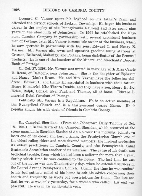 Leonard C. Varner spent his boyhood on his father's farm and attended the district schools of Jackson Township. He began his business career in the employ of the Pennsylvania Railroad and later spent nine years in the steel mills of Johnstown. In 1901 he established the Keystone Lumber Company in partnership with several prominent business men of Portage; later Mr. Varner became sole owner of the business, which he now operates in partnership with his sons, Edward L. and Henry E. Varner. Mr. Varner also owns and operates gasoline filling stations at Cresson, Bellwood, Mahaffey, and Portage, being distributor of the Pennzoil products. He is one of the founders of the Miners' and Merchants' Deposit Bank of Portage. Dr. Campbell Sheridan. (From the Johnstown Daily Tribune of Oct. 18, 1904.) "In the death of Dr. Campbell Sheridan, which occurred at the stone mansion in Sheridan Station at 3:15 o'clock this morning, Johnstown loses one of its oldest and best citizens, the Presbyterian Church one of the oldest ruling elders and most devoted members, the medical profession its oldest practitioner in Cambria County, and the Pennsylvania Canal Boatmen's Association another of its veterans. The cause of his death was bronchial trouble, from which he had been a sufferer for more than a year, during which time he was confined to the house. The last time he was out of the house was last Thanksgiving day, when he attended services in the Laurel Avenue Presbyterian Church. During the time he was confined to his bed patients called at his home to ask his advice concerning their health and frequently he wrote out prescriptions for them. The last one that he wrote was only yesterday, for a woman who called. His end was peaceful. He was in his eighty-sixth year. |