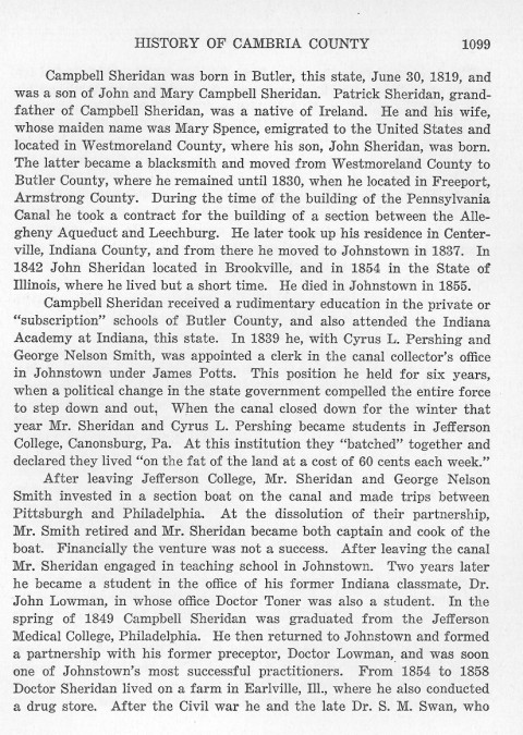 After leaving Jefferson College, Mr. Sheridan and George Nelson Smith invested in a section boat on the canal and made trips between Pittsburgh and Philadelphia. At the dissolution of their partnership, Mr. Smith retired and Mr. Sheridan became both captain and cook of the boat. Financially the venture was not a success. After leaving the canal Mr. Sheridan engaged in teaching school in Johnstown. Two years later he became a student in the office of his former Indiana classmate, Dr. John Lowman, in whose office Doctor Toner was also a student. In the spring of 1849 Campbell Sheridan was graduated from the Jefferson Medical College, Philadelphia. He then returned to Johnstown and formed a partnership with his former preceptor, Doctor Lowman, and was soon one of Johnstown's most successful practitioners. From 1854 to 1858 Doctor Sheridan lived on a farm in Earlville, Ill., where he also conducted a drug store. After the Civil war he and the late Dr. S. M. Swan, who