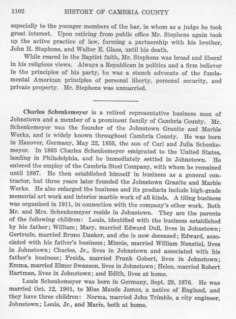 especially to the younger members of the bar, in whom as a judge he took great interest. Upon retiring from public office Mr. Stephens again tool up the active practice of law, forming a partnership with his brother, John H. Stephens, and Walter E. Glass, until his death. Charles Schenkemeyer is a retired representative business man of Johnstown and a member of a prominent family of Cambria County. Mr. Schenkemeyer was the founder of the Johnstown Granite and Marble Works, and is widely known throughout Cambria County. He was born in Hanover, Germany, May 22, 1855, the son of Carl and Julia Schenkemeyer. In 1883 Charles Schenkemeyer emigrated to the United States, landing in Philadelphia, and he immediately settled in Johnstown. He entered the employ of the Cambria Steel Company, with whom he remained until 1887. He then established himself in business as a general contractor, but three years later founded the Johnstown Granite and Marble Works. He also enlarged the business and its products include high-grad memorial art work and interior marble work of all kinds. A tiling business was organized in 1911, in connection with the company's other work. Both Mr. and Mrs. Schenkemeyer reside in Johnstown. They are the parents of the following children; Louis, identified with the business established by his father; William; Mary, married Edward Dull, lives in Johnstown; Gertrude, married Bruno Danker, she is now deceased; Edward, associated with his father's business; Minnie, married to William Nenstiel, lives in Johnstown; Charles, Jr., lives in Johnstown and associated with his fathers business; Freida, married Frank Gobert, lives in Johnstown; Emma, married Elmer Swanson, lives in Johnstown; Helen, married Robert Hartman, lives in Johnstown; and Edith, lives at home. Louis Schenkemeyer was born in Germany, Sept. 29, 1876. He was married Oct. 12, 1901, to Miss Maude James, a native of England, and they have three children: Norma; married John Trimble, a city engineer, Johnstown; Louis, Jr., and Marie, both at home. |