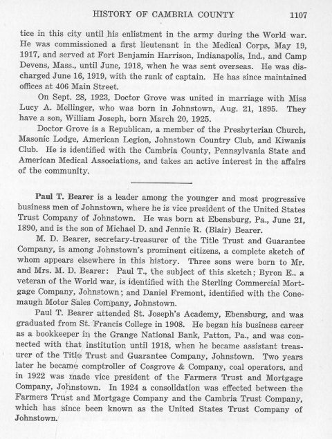 tice in this city until his enlistment in the army during the World war. He was commissioned a first lieutenant in the Medical Corps, May 19, 1917, and served at Fort Benjamin Harrison, Indianapolis, Ind., and Camp Devens, Mass., until June, 1918, when he was sent overseas. He was discharged June 16, 1919, with the rank of captain. He has since maintained offices at 406 Main Street. Paul T. Bearer is a leader among the younger and most progressive business men of Johnstown, where he is vice president of the United States Trust Company of Johnstown. He was born at Ebensburg, Pa., June 21, 1890, and is the son of Michael D. and Jennie R. (Blair) Bearer. M. D. Bearer, secretary-treasurer of the Title Trust and Guarantee Company, is among Johnstown's prominent citizens, a complete sketch of whom appears elsewhere in the history. Three sons were born to Mr. and Mrs. M. D. Bearer: Paul T., the subject of this sketch; Byron E., a veteran of the World war, is identified with the Sterling Commercial Mortgage Company, Johnstown; and Daniel Fremont, identified with the Conemaugh Motor Sales Company, Johnstown. |
