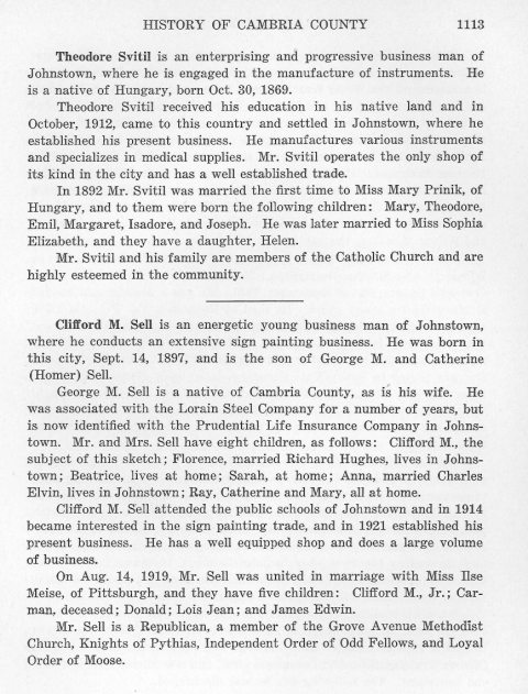 Theodore Svitil is an enterprising and progressive business man of Johnstown, where he is engaged in the manufacture of instruments. He is a native of Hungary, born Oct. 30, 1869. Clifford M. Sell is a energetic young business man of Johnstown, where he conducts an extensive sign painting business. He was born in this city, Sept. 14, 1897, and is the son of George M. and Catherine (Homer) Sell. George M. Sell is a native of Cambria County, as is his wife. He was associated with the Loraine Steel Company for a number of years, but is now identified with the Prudential Life Insurance Company in Johnstown. Mr. and Mrs. Sell have eight children as follows: Clifford M., the subject of this sketch; Florence, married Richard Hughes, lives in Johnstown; Beatrice, lives at home; Sarah, at home; Anna, married Charles Elvin, lives in Johnstown; Ray, Catherine and Mary, all at home. Clifford M. Sell attended the public schools of Johnstown and in 1914 became interested in the sign painting trade, and in 1921 established his present business. He has a well equipped shop and does a large volume of business. On Aug. 14, 1919, Mr. Sell was united in marriage with Miss Ilse Meise, of Pittsburgh, and they have five children: Clifford M., Jr.; Carman, deceased; Donald; Lois Jean; and James Edwin. Mr. Sell is a Republican, a member of the Grove Avenue Methodist Church, Knights of Pythias, Independent Order of Odd Fellows, and Loyal Order of Moose. |