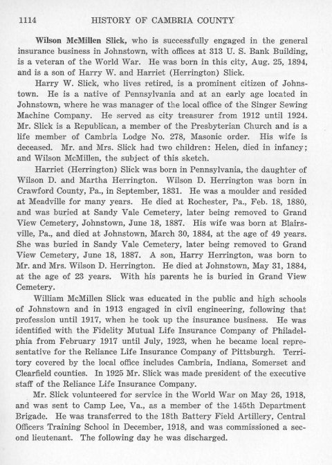 Harry W. Slick, who lives retired, is a prominent citizen of Johnstown. He is a native of Pennsylvania and at an early age located in Johnstown, where he was a manager of the local office of the Singer Sewing Machine Company. He served as city treasurer from 1912 until 1924. Mr. Slick is a Republican, a member of the Presbyterian Church and is a life member of Cambria Lodge No. 278, Masonic order. His wife is deceased. Mr. and Mrs. Slick had two children: Helen, died in infancy; and Wilson McMillen, the subject of this sketch.