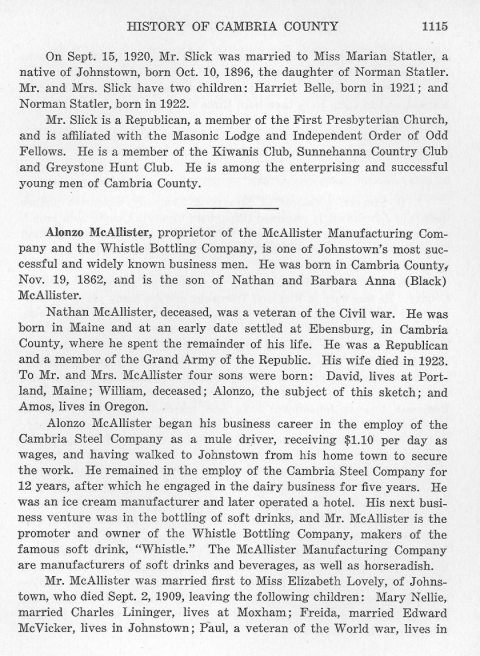 On Sept. 15, 1920, Mr. Slick was married to Miss Marian Statler, a native of Johnstown, born Oct. 10, 1896, the daughter of Norman Statler. Mr. and Mrs. Slick have two children: Harriet Belle, born in 1921; and Norman Statler, born in 1922. Alonzo McAllister, proprietor of the McAllister Manufacturing Company and the Whistle Bottling Company, is on of Johnstown's most successful and widely known business men. He was born in Cambria County, Nov. 19, 1862, and is the son of Nathan and Barbara Anna (Black) McAllister. Nathan McAllister, deceased, was a veteran of the Civil war. He was born in Maine and at an early date settled at Ebensburg, in Cambria County, where he spent the remainder of his life. He was a Republican and a member of the Grand Army of the Republic. His wife died in 1923. To Mr. and Mrs. McAllister four sons were born: David, lives at Portland, Maine; William, deceased; Alonzo, the subject of this sketch; and Amos, lives in Oregon. Alonzo McAllister began his business career in the employ of the Cambria Steel Company as a mule driver, receiving $1.10 per day as wages, and having walked to Johnstown from his home town to secure the work. He remained in the employ of the Cambria Steel Company for 12 years, after which he engaged in the dairy business for five years. He was an ice cream manufacturer and later opened a hotel. His next business venture was in the bottling of soft drinks, and Mr. McAllister is the promoter and owner of the Whistle Bottling Company, makers of the famous soft drink "Whistle". The McAllister Manufacturing Company are manufacturers of soft drinks and beverages, as well as horseradish. Mr. McAllister was married first to Miss Elizabeth Lovely, of Johnstown, who died Sept. 2 1909, leaving the following children: Mary Nellie, married Charles Lininger, lives at Moxham; Freida, married Edward McVicker, lives in Johnstown; Paul, a veteran of the World war, lives in |