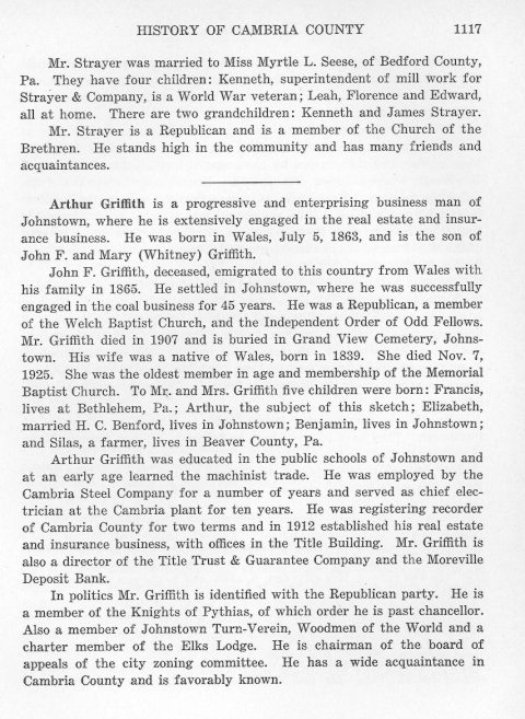 Mr. Strayer was married to Miss Myrtle L. Seese, of Bedford County, Pa. They have four children: Kenneth, superintendent of mill work for Strayer & Company, is a World War veteran; Leah, Florence and Edward, all at home. There are two grandchildren: Kenneth and James Strayer. Arthur Griffith is a progressive and enterprising business man of Johnstown, where he is extensively engaged in the real estate and insurance business. He was born in Wales, July 5, 1863, and is the son of John F. and Mary (Whitney) Griffith. John F. Griffith, deceased, emigrated to this country from Wales with his family in 1865. He settled in Johnstown, where he was successfully engaged in the coal business for 45 years. He was a Republican, a member of the Welch Baptist Church, and the Independent Order of Odd Fellows. Mr. Griffith died in 1907 and is buried in Grand View Cemetery, Johnstown. His wife was a native of Wales, born in 1839. She died Nov. 7, 1925. She was the oldest member on age and membership of the Memorial Baptist Church. To Mr. and Mrs. Griffith five children were born: Francis, lives in Bethlehem, Pa.; Arthur, the subject of this sketch; Elizabeth, married H. C. Benford, lived in Johnstown; Benjamin, lives in Johnstown; And Silas, a farmer, lives in Beaver County, Pa. Arthur Griffith was educated in the public schools of Johnstown and at an early age learned the machinist trade. He was employed by the Cambria Steel Company for a number of years and served as chief electrician at the Cambria plant for ten years. He was registering recorder of Cambria County for two terms and in 1912 established his real estate and insurance business, with offices in the Title Building. Mr. Griffith is also a director of the Title Trust & Guarantee Company and the Moreville Deposit Bank. In politics Mr. Griffith is identified with the Republic party. He is a member of the knights of Pythias, of which order he is past chancellor. Also a member of Johnstown Turn-Verein, Woodmen of the World and a charter member of the Elks Lodge. He is chairman of the board of appeals of the city zoning committee. He has a wide acquaintance on Cambria County and is favorably known. |