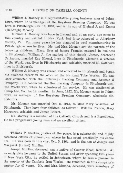 Joseph Murtha, deceased, was a native of County Mead, Ireland. At an early date he came to the United States, and after spending two years in New York City, He settled in Johnstown, where he was a pioneer in the employ of the Cambria Iron Works. He remained in this company's employ for 45 years. Mr. and Mrs. Murtha, deceased, were members
