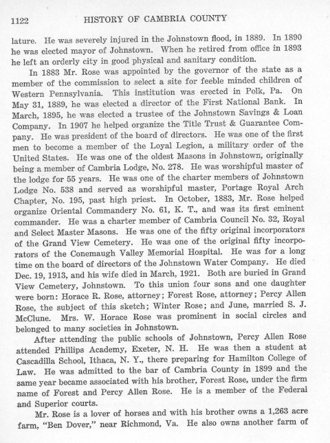 In 1883 Mr. Rose was appointed by the governor of the state as a member of the commission to select a site for feeble minded children of Western Pennsylvania. This institution was erected n Polk, Pa. On May 31, 1889, he was elected a director of the First Nation Bank. In March, 1895, he was elected a trustee of the Johnstown Savings & Loan Company. He was president of the board of directors. He was one of the first men to become a member of the Loyal Legion, a military order of the United States. He was one of the oldest Masons in Johnstown, originally being a member of Cambria Lodge, No. 278. He was worshipful master of the lodge for 55 years. He was one of the charter members of Johnstown Lodge No. 538 and served as worshipful master, Portage Royal Arch Chapter, No. 195, past high priest. In October, 1883, Mr. Rose helped organize Oriental commandery No. 61, K. T., and was its first eminent commander. He was a charter member of Cambria Council No. 32, Royal and Select Master Masons. He was one of the fifty original incorporators of the Grand View Cemetery. He was one of the original fifty incorporators of the Conemaugh Valley Hospital. He was for a long time on the board of directors of the Johnstown Water Company. He died Dec. 19, 1913, and his wife died in March, 1921. Both are buried in Grand View Cemetery, Johnstown. To this union four sons and one daughter were born: Horace R. Rose, attorney; Forest Rose, attorney; Percy Allen Rose, the subject of this sketch; Winter Rose; and June, married S. J. McClune. Mrs. W. Horace Rose was prominent in social circles and belong to many societies in Johnstown.
