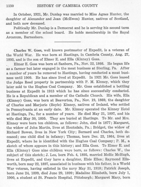 In October, 1921, Mr. Dunlap was married to Miss Agnes Hunter, the daughter of Alexander and Jean (McEwen) Hunter, natives of Scotland, and both now deceased. Charles W. Goss, well known postmaster of Expedit, is a veteran of the World War. He was born at Hastings, in Cambria County, Aug. 27, 1893, and is the son of Elmer E. and Ella (Kinney) Goss. Elmer E. Goss was born at Sanborn, Pa., Nov. 22, 1866. He began life as a farmer but later engaged in the meat business at Sterling, Pa. After a number of years he removed to Hastings, having conducted a meat business until 1909. He has since lived at Expedit. In 1921 Mr. Goss leased the Judge Reed property in partnership with P. M. Kinney, which they later sold to the Hughes Coal Company. Mr. Goss established a bottling business at Expedit in 1913 which he has since successfully conducted. He is a Republican and a member of the Catholic Church. His wife, Ella (Kinney) Goss, was born at Beaverton, Pa., Nov. 19, 1869, the daughter of Charles and Marjorie (Boyle) Kinney, natives of Ireland, who settled in Pennsylvania at an early date. Mr. Kinney operated the Kinney Hotel at Hastings, Pa., for a number of years. He died May 21, 1897, and his wife died May 30, 1895. They are buried at Hastings. To Mr. and Mrs. Kinney were born ten children, as follows: John, died in 1877; Margaret, the widow of John Martin, lives at Houtzdale, Pa.; Bridget, the widow of Richard Bowen, lives in New York City; Bernard and Charles, both deceased; one child died in infancy; Thomas, born Dec. 23, 1864, lives at Expedit, where he is identified with the Hughes Coal Company; P. M., a sketch of whom appears in this history; and Ella Goss. To Elmer E., and Ella (Kinney) Goss nine children were born, as follows: Charles W., the subject of this sketch; J. Leo, born Feb. 4, 1895, married Mollie McHugh, lives at Expedit, and they have a daughter, Elsie Ellen; Raymond Ellsworth, born May 22, 1897, associated in business with his father, is a World War veteran, having enlisted in the navy May 31, 1918; Patrick Joseph, born June 24, 1899, died June 9, 1899; Madaline Elizabeth, born July 1, 1900, a student at St. Francis Hospital, Pittsburgh; Margaret Mary, born |