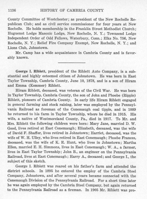 County Committee of Westchester; as president of the New Rochelle Republican Club; and as civil service commissioner for four years at New Rochelle. He holds membership in the Franklin Street Methodist Church; Huguenot Lodge Masonic Lodge, New Rochelle, N. Y.; Townsend Lodge Independent Order of Odd Fellows, Waterbury, Conn.; Elks No. 756, New Rochelle, N. Y.; Relief Fire Company Exempt, New Rochelle, N. Y.; and Lions Club, Johnstown. George I. Riblett, president of the Riblett Auto Company, is a substantial and highly esteemed citizen of Johnstown. He was born in East Taylor Township, Cambria County, June 10, 1878, and is a son of Hiram and Emma (Kemmer) Riblett. Hiram Riblett, deceased, was veteran of the Civil War. He was born in Taylor Township, Cambria County, the son of John and Phoebe (Ripple) Riblett, pioneers of Cambria County. In early life Hiram Riblett engaged in general farming and stock raising, later was employed by the Pennsylvania Railroad as foreman of the Conemaugh coal tipple, and in 1889 he returned to his farm in Taylor Township, where he died in 1915. His wife, a native of Westmoreland County, Pa., died in 1917. To Mr. and Mrs. Riblett the following children were born: Mary Jane, married D. W. Good, lives retired at East Conemaugh; Elizabeth, deceased, was the wife of David F. Shaffer, lives retired in Johnstown; Harriet, deceased, was the wife of W. H. Ulley, who lives retired in East Conemaugh; Phoebe Frances, deceased, was the wife of K. E. Hunt, who lives in Johnstown; Martha Ellen, married E. H. Simmons, lives in East Conemaugh; W. A., a farmer, lives in East Taylor Township; John B., an engineer on the Pennsylvania Railroad, lives at East Conemaugh; Harry A., deceased; and George I., the subject of the sketch. George I. Riblett was reared on his father's farm and attended the district schools. In 1895 he entered the employ of the Cambria Steel Company, Johnstown, and after several years became connected with the Conemaugh Division of the Pennsylvania Railroad. For a short time later he was again employed by the Cambria Steel Company, but again returned to the Pennsylvania Railroad as a fireman. In 1905 Mr. Riblett was pro- |