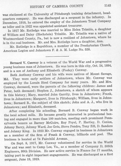 was stationed at the University of Pittsburgh training detachment, headquarters company. He was discharged as a sergeant in the infantry. In December, 1910, he entered the employ of the Johnstown Trust Company as teller and in 1922 was appointed assistant treasurer Bernard V. Conway is a veteran of the World War and a progressive young business man of Johnstown. He was born in this city, Oct. 24, 1894, and is a son of Anthony and Elizabeth (Feeley) Conway. Both Anthony Conway and his wife were native of Mount Savage, Md. They were early settlers of Johnstown, where Mr. Conway was employed by the Lorain Steel Company for many years. Mr. and Mrs. Conway, deceased, were the parents of the following children: James and Peter, both deceased; Stephen J., Johnstown, a sketch of whom appears in this history; Mary, married John Garrity, lives in Johnstown; Frank, lives in Johnstown; Margaret, lives in Pittsburgh; William, lives in Johnstown; Bernard B., the subject of this sketch; John and A.J., who live in Johnstown; and Elizabeth, deceased. After completing his schooling, Bernard B. Conway began work in the local school mills. He became greatly interested in professional boxing and engaged in more than 100 matches, meeting such prominent Pennsylvania boxers as Barney McGuire, Roy Pryel, P. Hartley, D. Conlon, Johnny Barry, Johnny Ward, Joe Getz, Steve Pendro, Tony Zill, D. Sanders and Johnny King. In 1923 Mr. Conway engaged in business in Johnstown as a member of the firm of Frank & Conway, billiards and pool. The business located at 74 Fairfield Avenue. On Sept. 8, 1917, Mr. Conway volunteered for service in the World War and was sent to Camp Lee, Va., as a member of Company D, 305th Engineers, 80th Division. He saw active service in France for 17 months, taking part in eight important engagements. He was discharged as a first sergeant, June 19, 1919. |