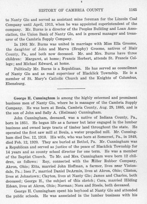 to Nanty Glo and served as assistant mine foreman for the Lincoln Coal Company until April, 1913, when he was appointed superintendent of the company. Mr. Burns is a director of the Peoples Building and Loan Association, the Union Bank of Nanty Glo, and is general manager and treasurer of the Cambria Supply Company. George H. Cunningham is among the highly esteemed and prominent business men of Nanty Glo, where he is manager of the Cambria Supply Company. He was born at Beula, Cambria County, Aug. 29, 1885, and is the son of John and Sally A. (Heilman) Cunningham. John Cunningham, deceased, was a native of Indiana County, Pa., born in 1851. He began life as a farmer but later engaged in the lumber business and owned large tracts of timber land throughout the state. He operated the first saw mill at Beula, a water propelled mill. Mr. Cunningham died Feb.12, 1920. They are buried at Bethel, Pa. Mr. Cunningham was a Republican and served as justice of the peace of Blacklick Township for 14 years and as county school director for one term. He was a member of the Baptist Church. To Mr. and Mrs. Cunningham were born 12 children, as follows: Roy, connected with the Miller Rubber Company, Akron, Ohio; Etta, married John Hoffman, a farmer, lives near Vintondale, Pa.; Inez P., married Daniel DeArmin, lives at Akron, Ohio; Clinton, lives at Johnstown; Clayton, lives at Nanty Glo; James and Charles, both deceased; George H., the subject of this sketch; Cora, married Hilding Edean, lives at Akron, Ohio; Norman; Nora and Steele, both deceased. George H. Cunningham spent his boyhood at Nanty Glo and attended the public schools. He was associated in the lumber business with his |