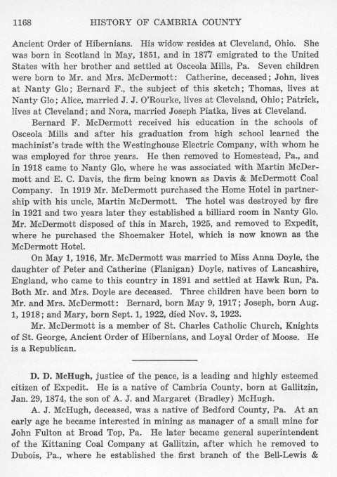 Ancient Order of Hibernians. His widow resides at Cleveland, Ohio. She was born in Scotland in May, 1851, and in 1877 emigrated to the United States with her brother and settled at Osceola Mills, Pa. Seven children were born to Mr. and Mrs. McDermott: Catherine, deceased; John, lives at Nanty Glo; Bernard F., the subject of this sketch; Thomas, lives at Nanty Glo; Alice, married J. J. O'Rourke, lives at Cleveland, Ohio; Patrick, lives at Cleveland; and Nora, married Joseph Piatka, lives at Cleveland. D. D. McHugh, justice of the peace, is a leading and highly esteemed citizen of Expedit. He is a native of Cambria County, born at Gallitzin, Jan. 29, 1874, the son of A. J. and Margaret (Bradley) McHugh. A. J. McHugh, deceased, was a native of Bedford County, Pa. At an early age he became interested in mining as manager of a small mine for John Fulton at Broad Top, Pa. He later became general superintendent of the Kittaning Coal Company at Gallitzin, after which he removed to Dubois, Pa., where he established the first branch of the Bell-Lewis & |