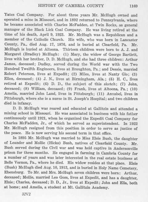 Yates Coal Company. For about three years Mr. McHugh owned and operated a mine in Missouri, and in 1892 returned to Pennsylvania, where he became associated with Charles McFadden, at Twin Rocks, as general manager of the Black Lick Coal Company. He was living retired at the time of his death, April 9, 1923. Mr. McHugh was a Republican and a member of the Catholic Church. His wife, who was born in Lancaster County, Pa., died Aug. 17, 1876, and is buried at Clearfield, Pa. Mr. McHugh is buried at Altoona. Thirteen children were born to A. J. and Margaret (Bradley) McHugh: (1) Mary, the widow of George Barlett, lives with her brother, D. D. McHugh, and she had three children: Arthur James, deceased; Dudley, served during the World war with the Two Hundred Twelfth Engineers, lives at Broughton, Pa.; and Dessie, married Robert Peterson, lives at Expedit; (2) Miles, lives at Nanty Glo; (3) Ellen, deceased; (4) J. N., lives at Birmingham, Ala.; (5) H. C., lives retired at Expedit; (6) D. D., the subject of this sketch; (7) John, deceased; (8) William, deceased; (9) Frank, lives at Altoona, Pa.; (10) Amelia, married John Land, lives in Pittsburgh; (11) Annabel, lives in