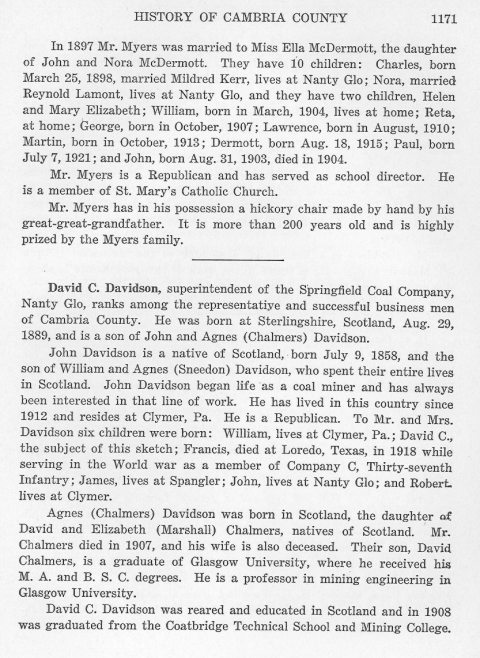In 1897 Mr. Myers was married to Miss Ella McDermott, the daughter of John and Nora McDermott. They have 10 children: Charles, born March 25, 1898, married Mildred Kerr, lives at Nanty Glo; Nora, married Reynold Lamont, lives at Nanty Glo, and they have two children, Helen and Mary Elizabeth; William, born in March, 1904, lives at home; Reta, at home; George, born in October, 1907; Lawrence, born in August, 1910; Martin, born in October, 1913; Dermott, born Aug. 18, 1915; Paul, born July 7, 1921; and John, born Aug. 31, 1903, died in 1904. David C. Davidson, superintendent of the Springfield Coal Company, Nanty Glo, ranks among the representative and successful business men of Cambria County. He was born at Sterlingshire, Scotland, Aug. 29, 1889, and is a son of John and Agnes (Chalmers) Davidson. John Davidson is a native of Scotland, born July 9, 1858, and the son of William and Agnes (Sneedon) Davidson, who spent their entire lives in Scotland. John Davidson began life as a coal miner and has always been interested in that line of work. He has lived in this country since 1912 and resides at Clymer, Pa. He is a Republican. To Mr. and Mrs. Davidson six children ere born: William, lives at Clymer, Pa.; David C., the subject of this sketch; Francis, died at Lorendo, Texas, in 1918 while serving in the World war as a member of Company C, Thirty-seventh Infantry; James, lives at Spangler; John, lives at Nanty Glo; and Robert, lives in Clymer. Agnes (Chalmers) Davidson was orn in Scotland, the daughter of David and Elizabeth (Marshall) Chalmers, natives of Scotland. Mr. Chalmers died in 1907, and his wife is also deceased. Their son, David Chalmers, is a graduate of Glasgow University, where he received his M. A. and B. S. C. degrees. He is a professor in mining engineering in Glasgow University. David C. Davidson was reared and educated in Scotland and in 1908 was graduated from the Coatbridge Technical School and Mining College. |