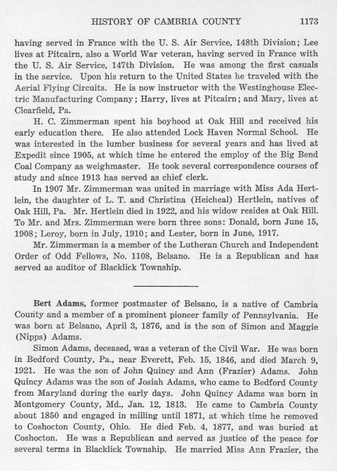 having served in France with the U. S. Air Service, 148th Division; lee lives at Pitcairn, also a World War veteran, having served in France with the U.S. Air Service, 147th Division. He was among the first casuals [sic] in the service. Upon his return to the United States he traveled with the Aerial Flying Circuits. He is now instructor with the Westinghouse Electric Manufacturing Company; Harry, lives at Pitcairn; and Mary, lives at Clearfield, Pa. Bert Adams, former postmaster of Belsano, is a native of Cambria County and a member of a prominent pioneer family of Pennsylvania. He was born at Belsano, April 3, 1876, and is the son of Simon and Maggie (Nipps) Adams. Simon Adams, deceased, was a veteran of the Civil War. He was born in Bedford County, Pa., near Everett, Feb. 15, 1846, and died March 9, 1921. He was the son of John Quincy and Ann (Frazier) Adams. John Quincy Adams was the son of Josiah Adams, who came to Bedford County from Maryland during the early days. John Quincy Adams was born in Montgomery County, Md., Jan. 12, 1813. He came to Cambria County about 1850 and engaged in milling until 1871, at which time he removed to Coshocton County, Ohio. He died Feb. 4, 1877, and was buried at Coshocton. He was a Republican and served as justice of the peace for several terms in Blacklick Township. He married Miss Ann Frazier, the |
