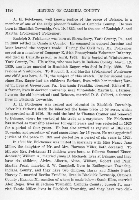 Rudolph S. Folckemer was born at Shrewsbury, York County, Pa. and in 1860 settled in Cambria County. He engaged in general farming and later learned the cooper's trade. During the Civil War Mr. Folckemer served as a member of Company E, 54th Pennsylvania Volunteer Infantry, and died in Danville prison in April, 1865. He is buried at Winterstown, York County, Pa. His widow, who was born in Indiana County, March 13, 1839, was later married to Hezekiah Rager, who died in July 1889. She resides at Vintondale. To Rudolph S. and Martha (Folckemer) Folckemer one child was born, A. H., the subject of this sketch. By her second marriage Mrs. Rager had six children: Barbara, lives with her mother; Daniel T., lives at Greensburg, Pa.; Benjamin Franklin, deceased; Richard H., a farmer, lives in Jackson Township near Vintondale; Martin S., a farmer, lives on the old homestead; and Rebecca, married D. S. Culbert, a farmer, lives in Blacklick Township.
