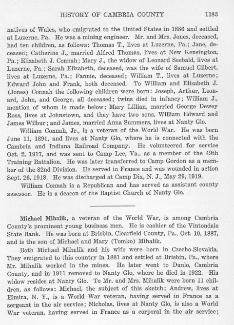 natives of Wales, who emigrated to the United States in 1886 and settled at Luzerne, Pa. He was a mining engineer. Mr. and Mrs. Jones, deceased, had ten children as follows: Thomas T., lives at Luzerne, Pa., Jane, deceased; Catherine J., married Alfred Thomas, lives at New Kensington, Pa.; Elizabeth J. Connah; Mary J., the widow of Leonard Seebald, lives at Luzerne, Pa.; Fannie, deceased; William T., lives at Luzerne; Edward John and Frank, both deceased. To William and Elizabeth J. (Jones) Connah the following children were born: Joseph, Arthur, Leonard, John and George, all deceased; twins died in infancy; William J., mention of whom is below; Mary, Lillian, married George Dewey Ross, lives at Johnstown, and they two sons, William Edward and James Wilbur; James married Anna Summers, live at Nanty Glo. Michael Mihalik, a veteran of the World War, is among Cambria County’s prominent young business men. He is a cashier of the Vintondale State Bank. He was born at Brisbin, Clearfield County, Pa., Oct. 10, 1887, and is the son of Micahel and Mary (Tomko) Mihalik. Both Michael Mihalik and his wife were born in Czecho-Slovakia. They emigrated to this country in 1881 and settled at Brisbin, Pa., where Mr. Mihalik worked in the mines. He later went to Dunlo, Cambria County, and in 1911 removed to Nanty Glo where he died in 1922. His widow resides at Nanty Glo. To Mr. and Mrs. Mihalik were born 11 children, as follows: Micahel, the subject of this sketch; Andrew, lives at Elmirs, N.Y., is World War veteran, having served in France as a sergeant in the air service; Nicholas, lives at Nanty Glo, is also a World War veteran, having served in France as a corporal in the air service; |