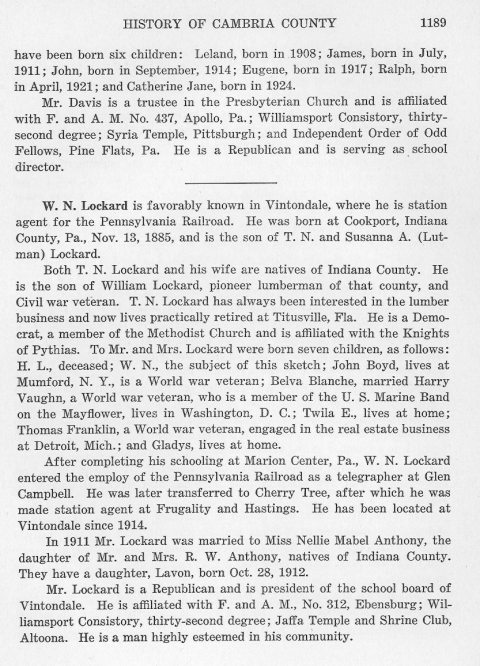 have been born six children: Leland, born in 1908; James, born in July 1911; John, born in September 1914; Eugene, born in 1917; Ralph, born in April 1921; and Catherine Jane, born in 1924. W. N. Lockard is favorably known in Vintondale, where he is station agent for the Pennsylvania Railroad. He was born at Cookport, Indiana County, Pa., Nov. 13, 1885, and is the son of T.N. and Susanna A. (Lutman) Lockard. Both T.N. Lockard and his wife are natives of Indiana County. He is the son of William Lockard, pioneer lumberman of that county, and Civil war veteran. T.N. Lockard has always been interested in the lumber business and now lives practically retired at Titusville, Fla. He is a Democrat, a member of the Methodist Church and affiliated with the Knights of Pythias. To Mr. and Mrs. Lockard were born seven children, as follows: H.L.., deceased; W.N., the subject of this sketch; John Boyd, lives at Mumford, N.Y., is a World war veteran; Belva Blanche, married Harry Vaughn, a World war veteran, who is a member of the U.S. Marine Band on the Mayflower, lives in Washington, D.C.; Twila E., lives at home; Thomas Franklin, a World war veteran, engaged in the real estate business at Detroit, Mich.; and Gladys, lives at home. After completing his schooling at Marion Center, Pa., W.N. Lockard entered the employ of the Pennsylvania Railroad as a telegrapher at Glen Campbell. He was later transferred to Cherry Tree, after which he was made station agent at Frugality and Hastings. He has been located at Vintondale since 1914. In 1911, Mr. Lockard was married to Miss Nellie Mabel Anthony, the daughter of Mr. and Mrs. R.W. Anthony, natives of Indiana County. They have a daughter, Lavon, born Oct.28, 1912. Mr. Lockard is a Republican and is president of the school board of Vintondale. He is affiliated with F. and A.M., No. 3122, Ebensburg; Williamsport Consistory, thirty-second degree; Jaffa Temple and Shrine Club, Altoona. He is a man highly esteemed in his community. |
