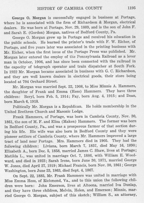 On Sept. 22, 1885, Mr. Frank Hammers was united in marriage with Miss Emma Hess, of Richmond, Va., and to this union the following children were born: John Emerson, lives at Altoona, married Iva Dunlap, and they have three children, Melvin, Helen, and Emerson; Minnie, married George O. Morgan, subject of this sketch; William S., an attorney