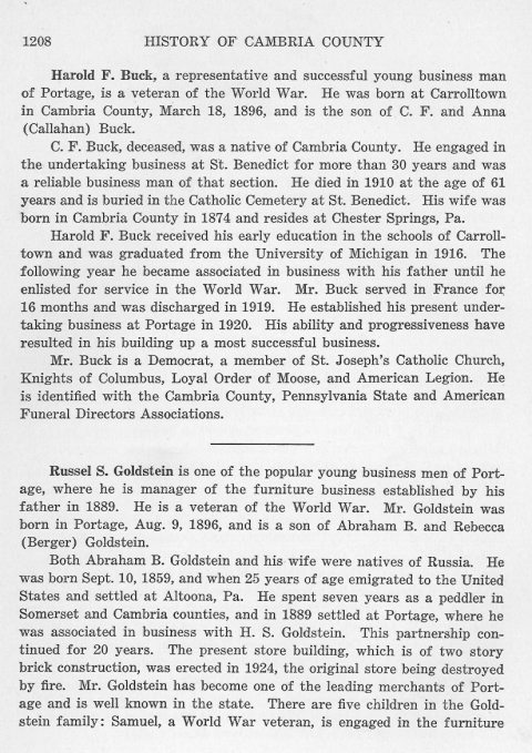 Harold F. Buck, a representative and successful young business man of Portage, is a veteran of the World War. He was born at Carrolltown in Cambria County, March 18, 1896, and is the son of C. F. and Anna (Callahan) Buck. Russel S. Goldstein is one of the poplar young business men of Portage, where he is manager of the furniture business established by his father in 1889. He is a veteran of the World War. Mr. Goldstein was born in Portage, Aug. 9, 1896, and is a son of Abraham B. and Rebecca (Berger) Goldstein. Both Abraham B. Goldstein and his wife were natives of Russia. He was born Sept. 10, 1859, and when 25 years of age emigrated to the United States and settled in Altoona, Pa. He spent seven years as a peddler in Somerset and Cambria counties, and in 1889 settled at Portage, where he was associated in business with H. S. Goldstein. This partnership continued for 20 years. The present store building, which is of two story brick construction, was erected in 1924, the original store being destroyed by fire. Mr. Goldstein has become one of the leading merchants of Portage and is well known in the state. There are five children in the Goldstein family: Samuel, a World War veteran, is engaged in the furniture |
