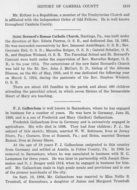 Mr. Kritzer is a Republican, a member of the Presbyterian Church and is affiliated with the Independent Order of Odd Fellows. He is well known throughout Cambria County. Saint Bernard's Roman Catholic Church, Hastings, Pa., was built under the direction of Rev. Edwin Pierron, O. S. B., and dedicated Jan. 18, 1891. He was succeeded successively by Rev. Innocent Andelfinger, O. S. B.; Rev. Germain Ball O. S. B.; Marcellus Retger, O. S. B.; Gabriel Schaller, O. S. B., and Stephen Wieland, O. S. B. The Parochial School and St. Bernard's Convent were built under the supervision of Rev. Marcellus Retger, O. S. B., in the year 1914. The cornerstone of the new Saint Bernard's Church was laid by the Rt. Rev. John J. McCort, D. D., bishop of the Altoona Diocese, on the 6th of May, 1923, and it was dedicated the following year on March 2, 1924, during the pastorate of the Rev. Stephen Weiland, O. S. B. There are about 415 families in the parish and about 400 children attending the parochial school, in which seven Sisters of the Immaculate Heart of Mary are teaching. F. J. Gallaschum is well known in Barnesboro, where he has engaged in business for a number of years. He was born in Germany, June 23, 1880, and is a son of Frederick and Mary (Gatkot) Gallaschum. Frederick Gallaschum lives in Germany and is extensively engaged in agriculture. His wife died in 1896. They had four children: F. J., the subject of this sketch; Minnie, married W. T. Robinson, lives at Jersey Shore, Pa.; Gustave, lives at Summit, Pa.; and Helen, married Herman Ramor, lives at Jersey Shore. At the age of 19 years F. J. Gallaschum emigrated to this country from Germany and settled at Austin, in Potter County, Pa. In 1905 he removed to Barnesboro, where he was associated in business with H. G. Lampmen for three years. He was later in partnership with Joseph Shoemaker and D. J. Bouger until 1916, when he engaged in business for himself. Mr. Gallaschum deals in high grade meats and provisions and is one of the pioneer merchants of the city. On Sept. 10, 1908, Mr. Gallaschum was married to Miss Nellie B. Trunbull, of Barnesboro, a daughter of James and Margaret Trumbull. |