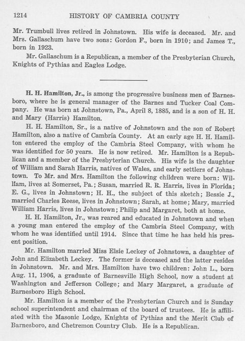 Mr. Trumbull lives retired in Johnstown. His wife is deceased. Mr. and Mrs. Gallaschum have two sons: Gordon F., born in 1910; and James T., born in 1923. H. H. Hamilton, Jr., is among the progressive business men of Barnesboro where he is general manager of the Barnes and Tucker Coal Company. He was born at Johnstown, Pa., April 8, 1885, and is a son of H. H. and Mary (Harris) Hamilton. H. H. Hamilton, Sr., is a native of Johnstown and the son of Robert Hamilton, also a native of Cambria County. At an early age H. H. Hamilton entered the employ of the Cambria Steel Company, with whom he was identified for 50 years. He is now retired. Mr. Hamilton is a Republican and a member of the Presbyterian Church. His wife is the daughter of William and Sarah Harris, natives of Wales, and early settlers of Johnstown. To Mr. and Mrs. Hamilton the following children were born: William, lives at Somerset, Pa.; Susan, married R. R. Harris, lives in Florida; E. G., lives in Johnstown; H. H., the subject of this sketch; Bessie J., married Charles Reese, lives in Johnstown; Sarah, at home; Mary married William Harris, lives in Johnstown; Philip and Margaret, both at home. H. H. Hamilton, Jr., was reared and educated in Johnstown and when a young man entered the employ of the Cambria Steel Company, with whom he was identified until 1914. Since that time he has held his present position. Mr. Hamilton married Miss Elsie Leckey of Johnstown, a daughter of John and Elizabeth Leckey. The former is deceased and the latter resides in Johnstown. Mr. and Mrs. Hamilton have two children: John L., born Aug. 11, 1906, a graduate of Barnesville High School, now a student at Washington and Jefferson College; and Mary Margaret, a graduate of Barnesboro High School. Mr. Hamilton is a member of the Presbyterian Church and is Sunday school superintendent and chairman of the board of trustees. He is affiliated with the Masonic Lodge, Knights of Pythias and the Merit Club of Barnesboro, and Chetremon Country Club. He is a Republican. |