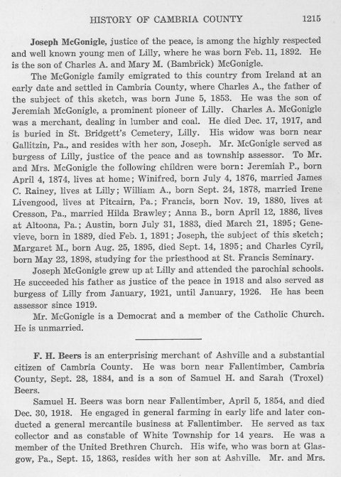 Joseph McGonigle grew up at Lilly and attended parochial schools. He succeeded his father as justice of the peace in 1918 and also served as burgess of Lilly from January, 1921, until January, 1926. He has been assessor since 1919.