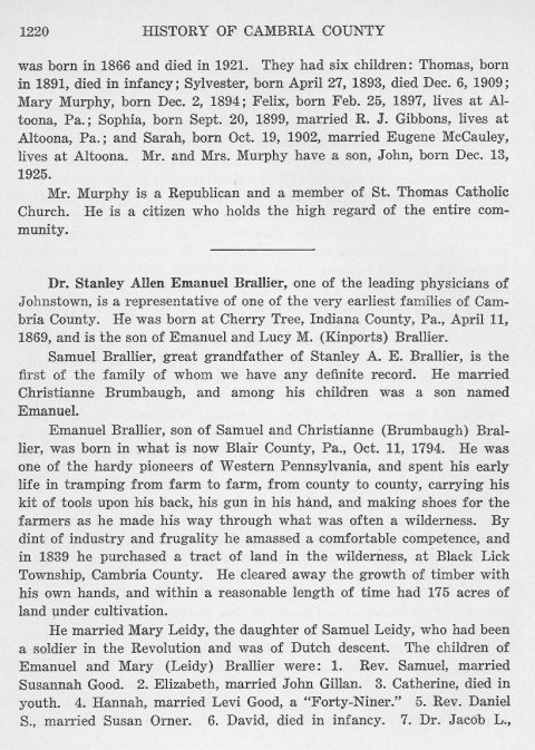 was born in 1866 and died in 1921. They had six children: Thomas, born in 1891, died in infancy; Sylvester, born April 27, 1893, died Dec. 6, 1909; Mary Murphy, born Dec. 2, 1894; Felix, born Feb. 25, 1897, lives at Altoona, Pa.; Sophia, born Sept. 20, 1899, married R. J. Gibbons, lives at Altoona, Pa.; and Sarah, born Oct. 19, 1902, married Eugene McCauley, lives at Altoona. Mr. And Mrs. Murphy have a son, John, born Dec. 13, 1925. Dr. Stanley Allen Emanuel Brallier, one of the leading physicians of Johnstown, is a representative of one of the very earliest families of Cambria County. He was born at Cherry Tree, Indiana County, Pa., April 11, 1869, and is the son of Emanuel and Lucy M. (Kinports) Brallier. Samuel Brallier, great grandfather of Stanley A. E. Brallier, is the first of the family of whom we have any definite record. He married Christianne Brumbaugh, and among his children was a son named Emanuel. Emanuel Brallier, son of Samuel and Christianne (Brumbaugh) Brallier, was born in what is now Blair County, Pa., Oct. 11, 1794. He was one of the hardy pioneers of Western Pennsylvania, and spent his early life in tramping from farm to farm, from county to county, carrying his kit of tools upon his back, his gun in his hand, and making shoes for the farmers as he made his way through what was often a wilderness. By dint of industry and frugality he amassed a comfortable competence, and in 1839 he purchased a tract of land in the wilderness, at Black Lick Township, Cambria County. He cleared away the growth of timber with his own hands, and within a reasonable length of time had 175 acres of land under cultivation. He married Mary Leidy, the daughter of Samuel Leidy, who had been a soldier in the Revolution and was of Dutch descent. The children of Emanuel and Mary (Leidy) Brallier were: 1. Rev. Samuel, married Susannah Good. 2. Elizabeth, married John Gillian. 3. Catherine, died in youth. 4. Hannah, married Levi Good, a "Forty-Niner." 5. Rev. Daniel S., married Susan Orner. 6. David, died in infancy. 7. Dr. Jacob L., |